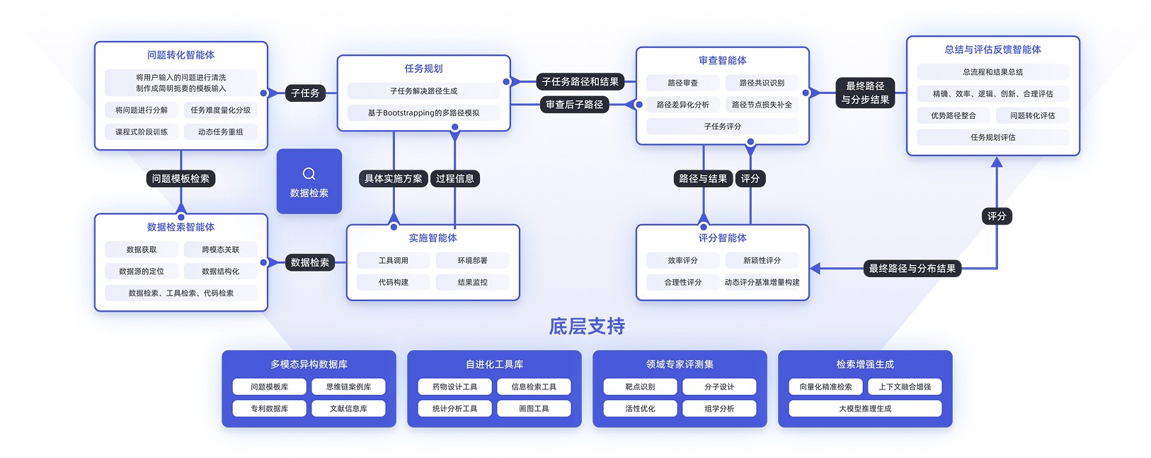 面向药物研发全流程的端到端AI多智能体系统。它先把用户输入的科学问题自动转化为可执行子任务,再通过任务规划智能体基于 Bootstrapping 算法生成多条候选路径;随后由实施智能体调用自进化工具库完成计算、实验或代码构建,并实时把数据与结果回传。路径与结果经审查智能体做共识识别、差异分析和缺失修补后,交由评分智能体从效率、新颖性、合理性等维度动态打分;最终由总结与评估反馈智能体整合最优路径、输出可解释报告,并把经验沉淀到多模态异构数据库与领域专家评测集中,实现下一轮"问题-任务-实施-审查-评估"闭环的持续进化。
